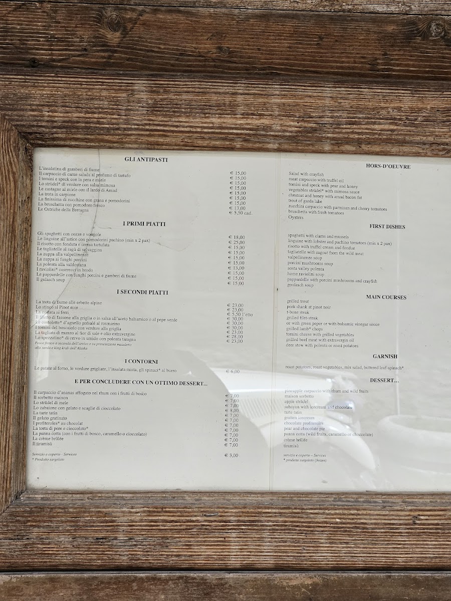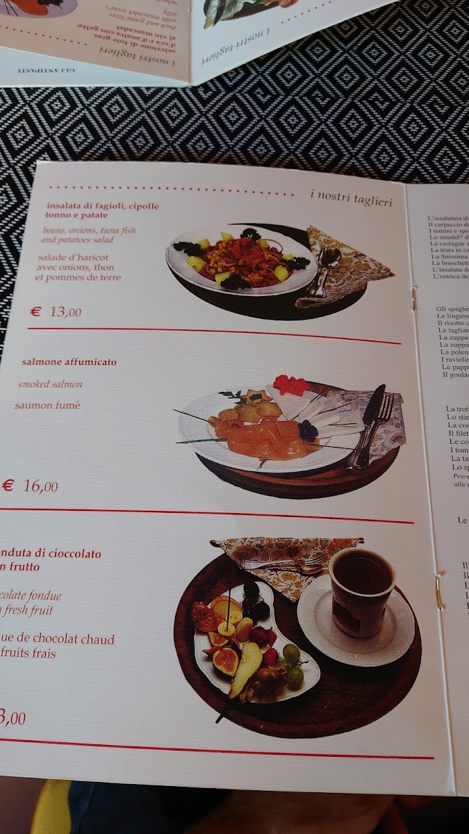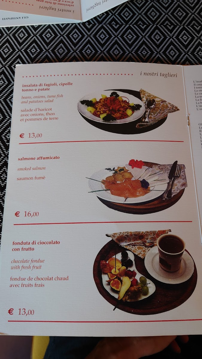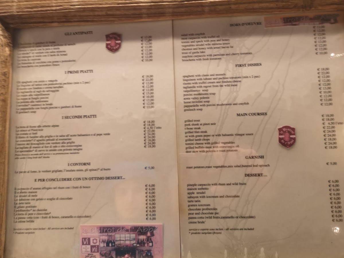 The menu at Le Bistrot De L'Abbé offers a delightful journey through authentic Italian flavors with a touch of Alpine influence. One of the standout dishes is the Tagliatelle Ragù Selvaggina, a rich pasta dish featuring a hearty game meat sauce that perfectly complements the fresh, handmade tagliatelle. Another dish that truly shines is the Deer Stew with Polenta, a tender, slow-cooked venison stew served with creamy polenta, making it a perfect winter meal. The wine selection also deserves a mention, with the Vino Rosso Della Valle, a full-bodied red wine that pairs beautifully with the robust flavors of the menu. For dessert, the Tortino Di Mele is a must-try; this warm apple cake with a hint of cinnamon offers a comforting finish to the meal. Overall, Le Bistrot De L'Abbé’s menu is a celebration of seasonal, locally sourced ingredients, offering both traditional dishes and comforting flavors that embody the essence of Italian alpine cuisine.